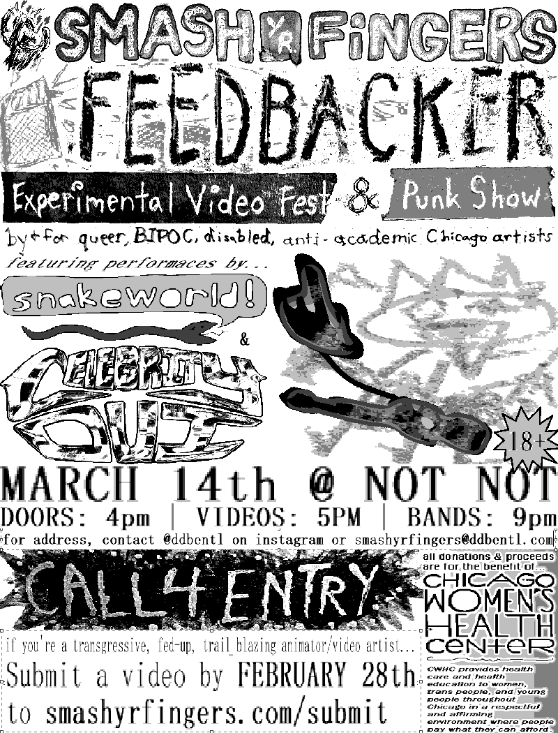 SMASH YR. FINGERS is an experimental animation / film / video art screening event series created by and for fed up, marginalized Chicago videomakers. this project aims to showcase videos that bend mediums, break conventions, and speak in a language distinct to bipoc, queer, disabled, or anti-academic artists.